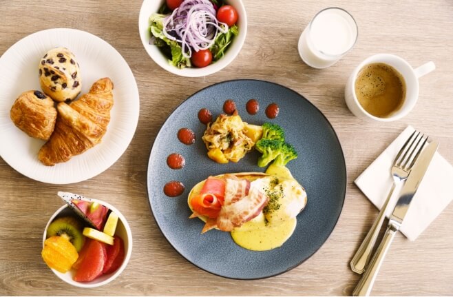 自然光が差し込む爽やかな空間で、地元食材を使った料理とサラダやフルーツ、ホテルメードのブレッドをお楽しみください。