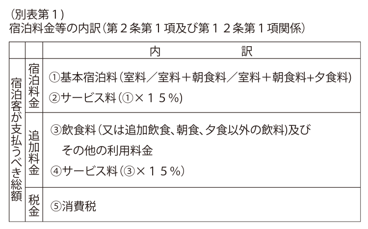 - 宿泊者が支払うべき宿泊料金等の内訳は、別表第1に掲げるところによります。